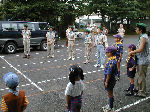 ≪出発式≫ 団舎前で行われた行われた出発式は、ベンチャースカウトが 進行役を務めてくれました。いよいよ夏キャンプ開始です! | ||