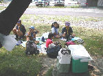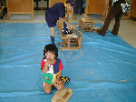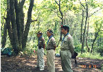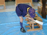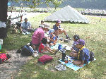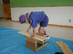 ≪カブ隊ビーバー隊昼食&木工細工≫ 一方その頃、カブ隊・ビーバー隊は小野上村の河川公園で仲良く昼 食をとり、その後、体験実習館で木工細工(本立て作り)に挑戦し ました。杉の板に線を引き、のこぎりで切ったあとカンナをかける 本格的な作業に四苦八苦しながらも、怪我もなく上手に完成です! |