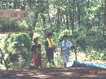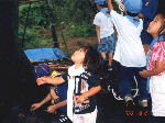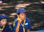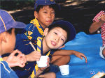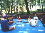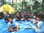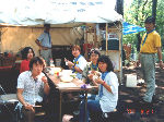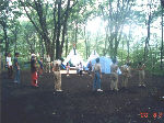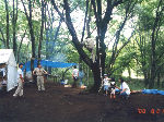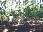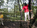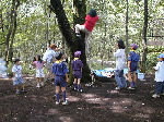 ≪木登り&ロープ渡り≫ ボーイ隊がハイキングに出かけた後のサイトを使って、木登りや ロープ渡りをしました。ついついやりたくなるお母さんもいて、 子供達もおおはしゃぎ!『ロープが地面についちゃう!』てか? |
