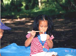 ≪楽しい昼食!≫ 運動した後の食事は、格別・・・今日のメニューは、二つに割っ た『青竹』によそってくれた『そうめん』です。夏キャンプなの に氷までのってたりして、美味しい・・・・・・・・・・・・! |