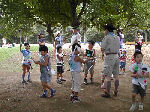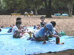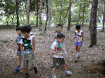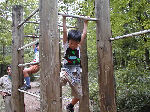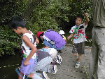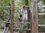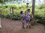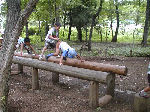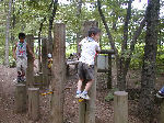 | 【 ジャングルの奥地へ・・・! 】 丸太橋や飛び石、鉄棒などを渡ってジャングルの奥 地へ出かけます。『みんな、落ちるなよ・・・!』 |