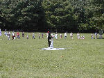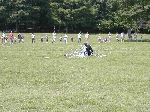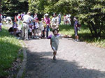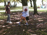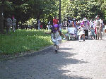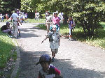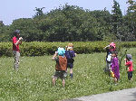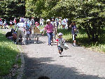 【 風よりも早く駆けろ! 】 胸に置いた新聞紙が落ちないように、全力疾走! こらこら、手で押さえちゃだめだよ〜ん・・・! |