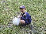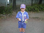 【 団舎に戻って・・・ 】 疲れきったリーダーとは対象的に元気なスカウト達・・・! キャンプ中に作ったクラフトを自慢げに見せてくれました。 |
