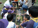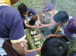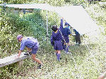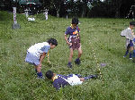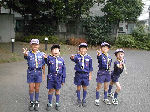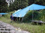 【 “デン”作り 】 まずはみんなでデン作り!袋に石を詰め込んで、デンの地均しに使ったリ 大きな石を利用した引き綱止め(ペグ代わり)等、みんなで工夫しました。 1組・2組の表札も付けて、どうです立派にできたしょう?・・・おみごと! |