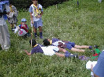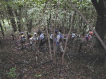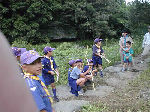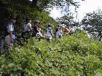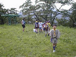 【 登山 】 原始人になって登山に行きました。頂上では身体を低くして 獲物に近づく練習や、弓矢の訓練も行いました。明るく広い 頂上とは対象的な、薄暗い『道なき道』を下山して来ました。 |