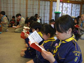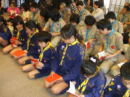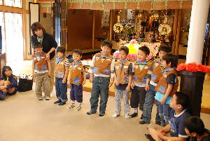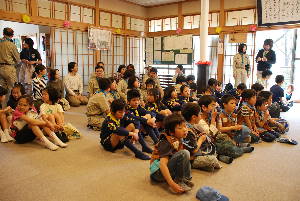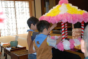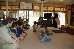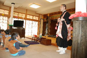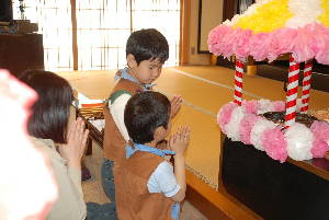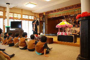 本願寺築地別院 東久留米会館でお坊様の話を聞いて、 お経をあげたり、お釈迦様に甘茶をかけたりして、 お誕生のお祝いをします。