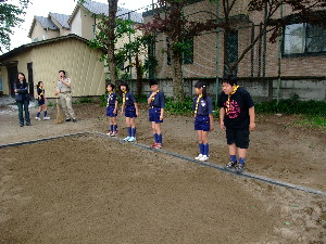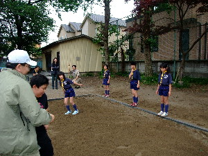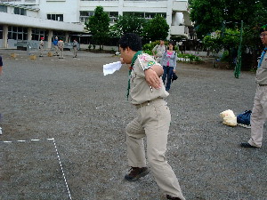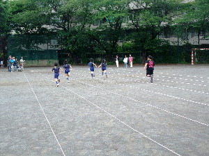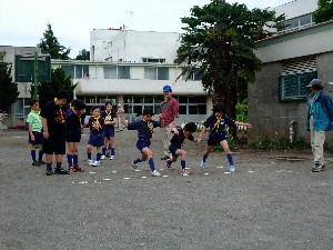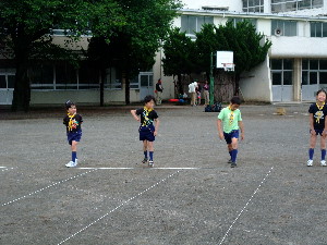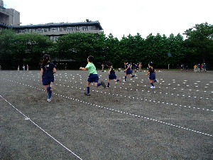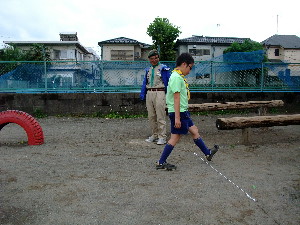 これからは組ごとにポイントを回って、各ポイントで、 50m走・碁石投げ・シャトル投げ・重量当て・長さ当て・立幅跳びをします。