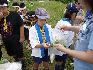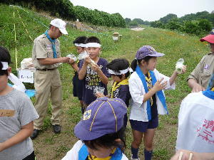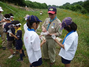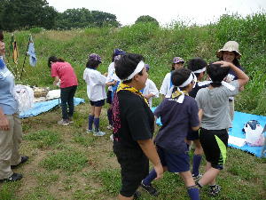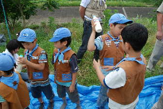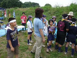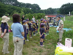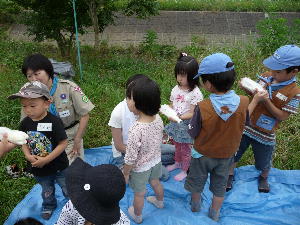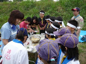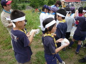 カブ隊はポテトサラダ作りからです。 まずは、はちまきとはっぴに着替えて、 おいしく作るぞ〜! できました〜!!!