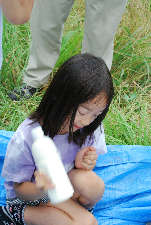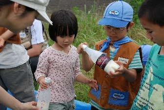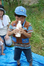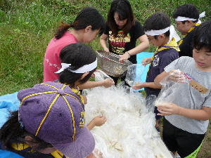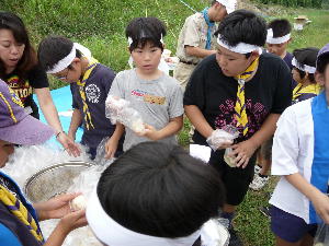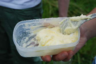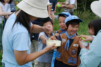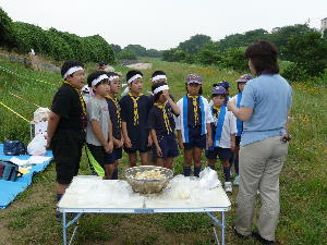 ビーバー隊はジャガバター作り! 牛乳とクリームを振ってバターを作ります。 ちょっと味見!?・・・・・おいしい〜!!