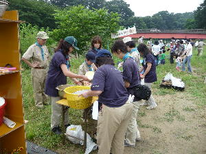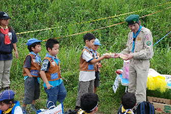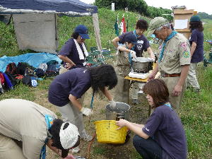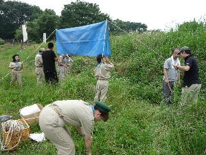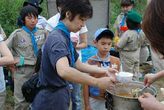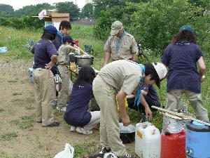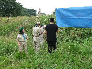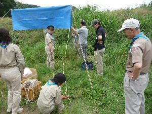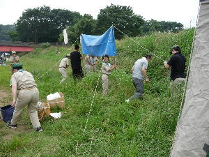 体験キャンプの方は、ローバー隊とボーイ隊と団委員を中心にフライ張りとカルビクッパ作り! がんばるぞ〜!