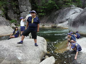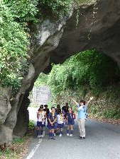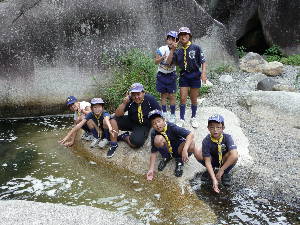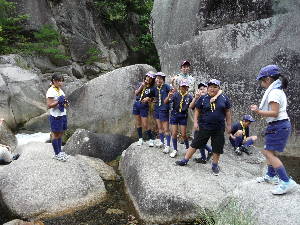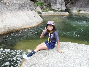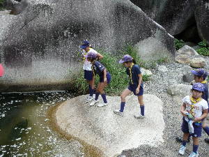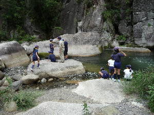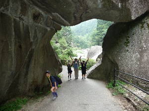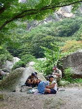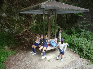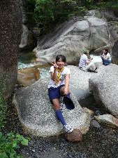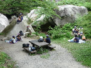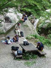 昇仙峡のバス停に到着! すご〜い! 甲府周辺は水晶の産地で有名です。 わーきれい! 格別の風景の中で、キャンプ最初の食事です。 いただきま〜す!おいしい〜! きもちいい〜!!