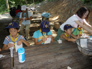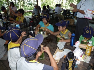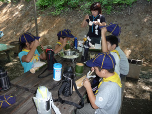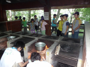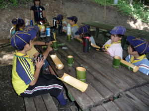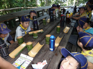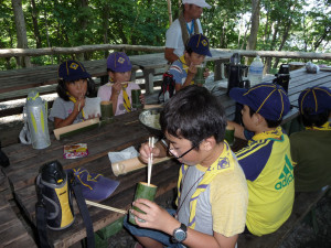 地図に従って着いた場所は炊事場です。 ここで、炊飯袋を使って、ごはんを作ります。 竹のアイテムで作った食器も準備完了!