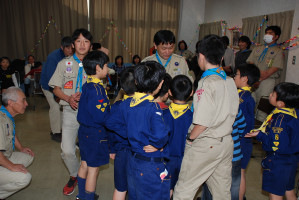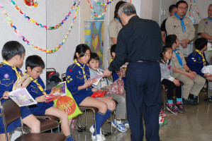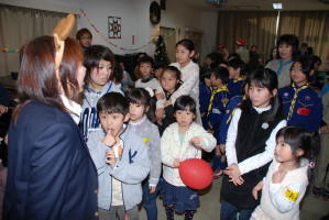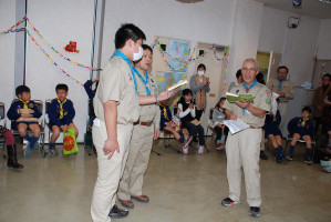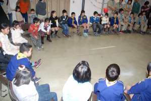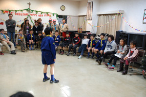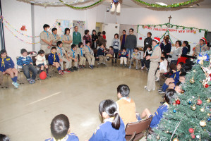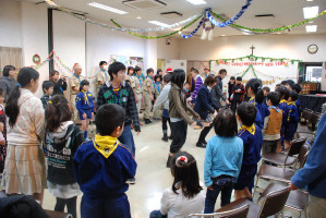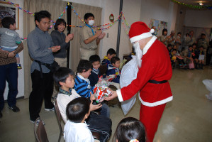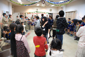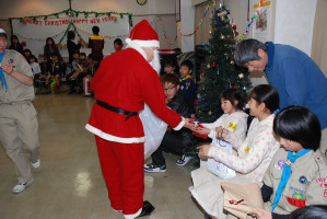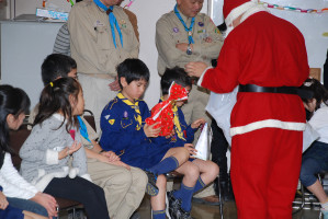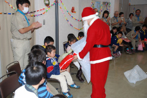 食事の後もゲームやソングで、まだまだ、盛り上がっていきます〜 そんな中・・どこからともなく、かすかに鈴の音が・・・!? サンタクロースがきてくれました〜! プレゼントをいただきました〜! サンタさん ありがとう〜!!! ベンチャー隊長の夜話に続き、しずけきの合唱の中、 神父様よりカードが配られ、2010年のクリスマス集会は〆です。