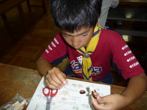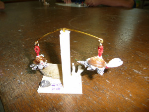 くまスカウトを送り出したあとは、創作室で貝細工の“ヤジカメ”作りにチャレンジします。