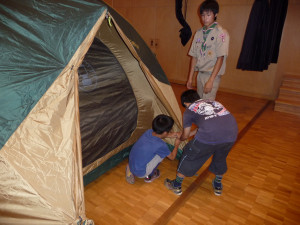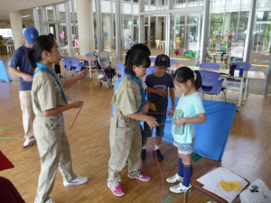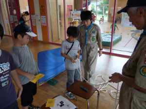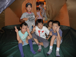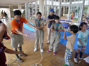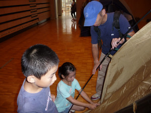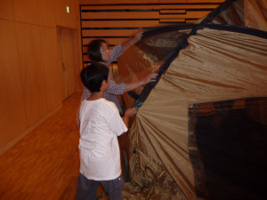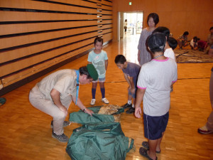 内容:野菜汁の試食・ビニール袋でご飯作り・テント作りと寝袋体験・防災人形劇 ・ロープワークなどの防災シミュレーションを兼ねた災害時疑似体験をします。