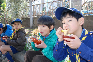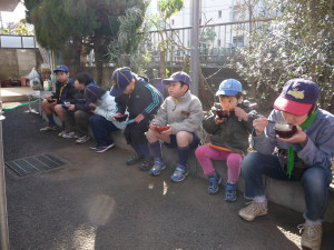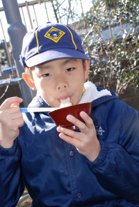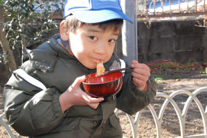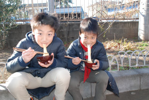 つき立てのおもちをお雑煮、きなこもち、 お汁粉、納豆もち、大根おろしもちにして、 感謝をこめて いただきま〜す! おもちをいただいたあとは、みんなで日枝神社に初詣に行きます。 今年も元気にがんばりましょう!