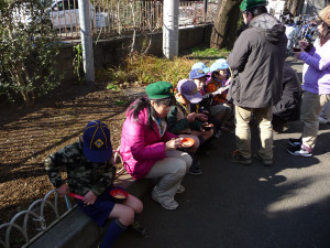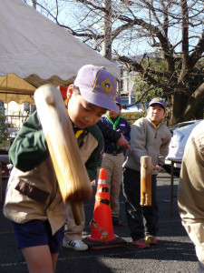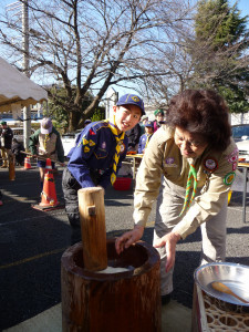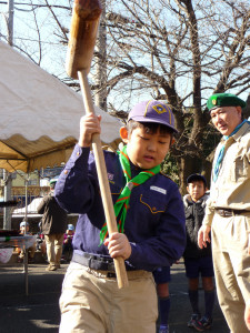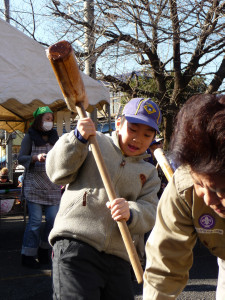 ここからは、掛け声に合わせて、みんなで元気におもちをつきます! ヨイショ〜!ヨイショ〜!